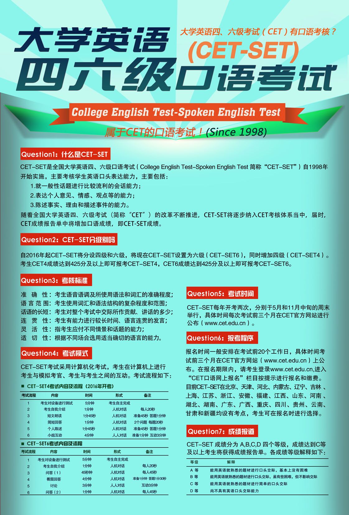 全国大学英语四、六级考试(CET)是教育部主办的一项大规模、标准化、考核大学生英语能力的全国统一考试,该项考试不仅包括考核学生听力、阅读、写作和翻译能力的考试,也包括考核考生口语能力的口试,即全国大学英语四、六级口语考试(CET一SET)。为进一步推进CET改革,提升在校大学生英语口语应用能力,教育部考试中心在全国部分省市开展了CET一SET试点考试。按照教育部考试中心的工作部署,我省在今年5月进行了首次CET一SET试点考试。为方便考生报考,现决定扩大CET一SET试点。现将有关事项通知如下: