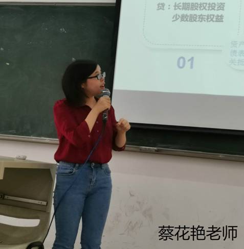 本次公开课由会计系、审计系和财务管理系分别推选一名老师讲授,这三名老师都是今年刚入职的青年老师。第一位授课老师是会计系的蔡花艳老师,蔡老师教授的课程是《高级财务会计学》,讲课题目是:内部股权投资。蔡老师讲课条理清晰,语言生动流畅,引导学生积极参与课堂互动。