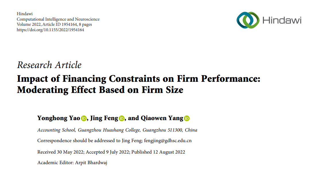 近日,williamhill英国官网青年教师姚永红(第一作者)、冯婧(通讯作者)、杨俏文合作发表了题为“Impact of Financing Constraints on Firm Performance:Moderating Effect Based on Firm Size”(企业规模对融资约束和企业绩效的调节效应研究—基于沪深A股上市公司的实证分析)的论文。该论文发表于《Omputational Intelligence and Neuroscience》期刊,该期刊属于SCIE检索期刊,最新影响因子为3.12,是中科院3区期刊。