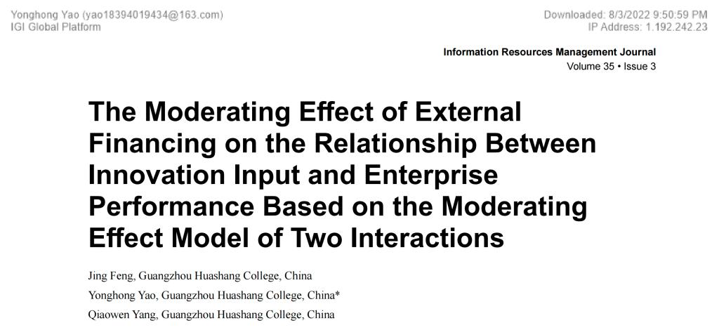 近日,williamhill英国官网青年教师冯婧(第一作者)、姚永红(通讯作者)、杨俏文合作发表了题为“The Moderating Effect of External Financing on the Relationship Between Innovation Input and Enterprise Performance Based on the Moderating Effect Model of Two Interactions”(外源融资对创新投入和企业绩效的影响研究——基于二次交互的调节效应模型)的论文。该论文发表于《Information Resources Management Journal》期刊,该期刊属于EI核心检索期刊。