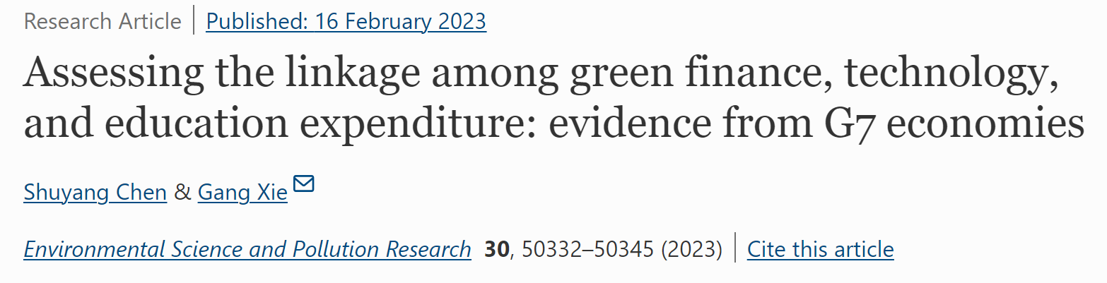 近日,williamhill英国官网青年教师陈淑扬以第一作者身份在《Environmental Science and Pollution Research》期刊发表了题为“Assessing the linkage among green fnance, technology,and education expenditure: evidence from G7 economies”的论文,该期刊属于SCIE检索期刊,是JCR Q1分区,中科院3区期刊。