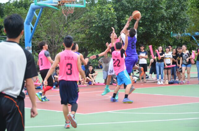 而后,双方运动员进场,在现场观众的热情呼喊声中,比赛正式拉开帷幕。比赛刚开场,身穿紫色球衣的1930队便率先进球,赢得观众的阵阵喝彩,紧接着,身着粉色球衣的财管队奋起直追,也接连进球。双方队员都斗志高昂,相互间都紧追不舍。随后,1930队的球员不断抓住好时机进行抢断,成功打乱了对方的进球节奏。同时财管队的队员也不甘示弱,在球场上快速反应,急中生智地截断对方球路,再加上完美的传球,快速扳回一成。上半场以20:15的比分结束,1930队领先财管队。