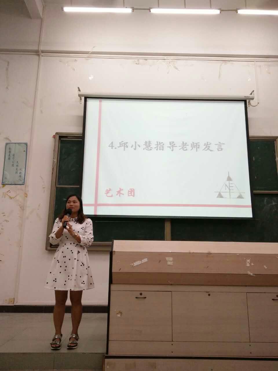 邱老师首先上台致词,欢迎新力量的加入和给予他们高度的期待,并明确了艺术团存在的意义与价值,指引了未来的发展方向。同时,她对艺术团成员提出了要求和期望,并以祝福语中结束了此次发言。