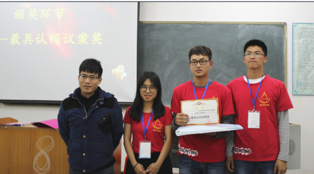 在三组特工阐述完他们的议案后,现场观众进行了投票,选出心目中最具认同的议案,而在工作人员进行计票的同时现场进行了游戏环节,以缓解现场的紧张气氛。最终,霸气侧漏组获得了“最具认同议案奖”,而团总支书记梁银雄也对其进行了颁奖。