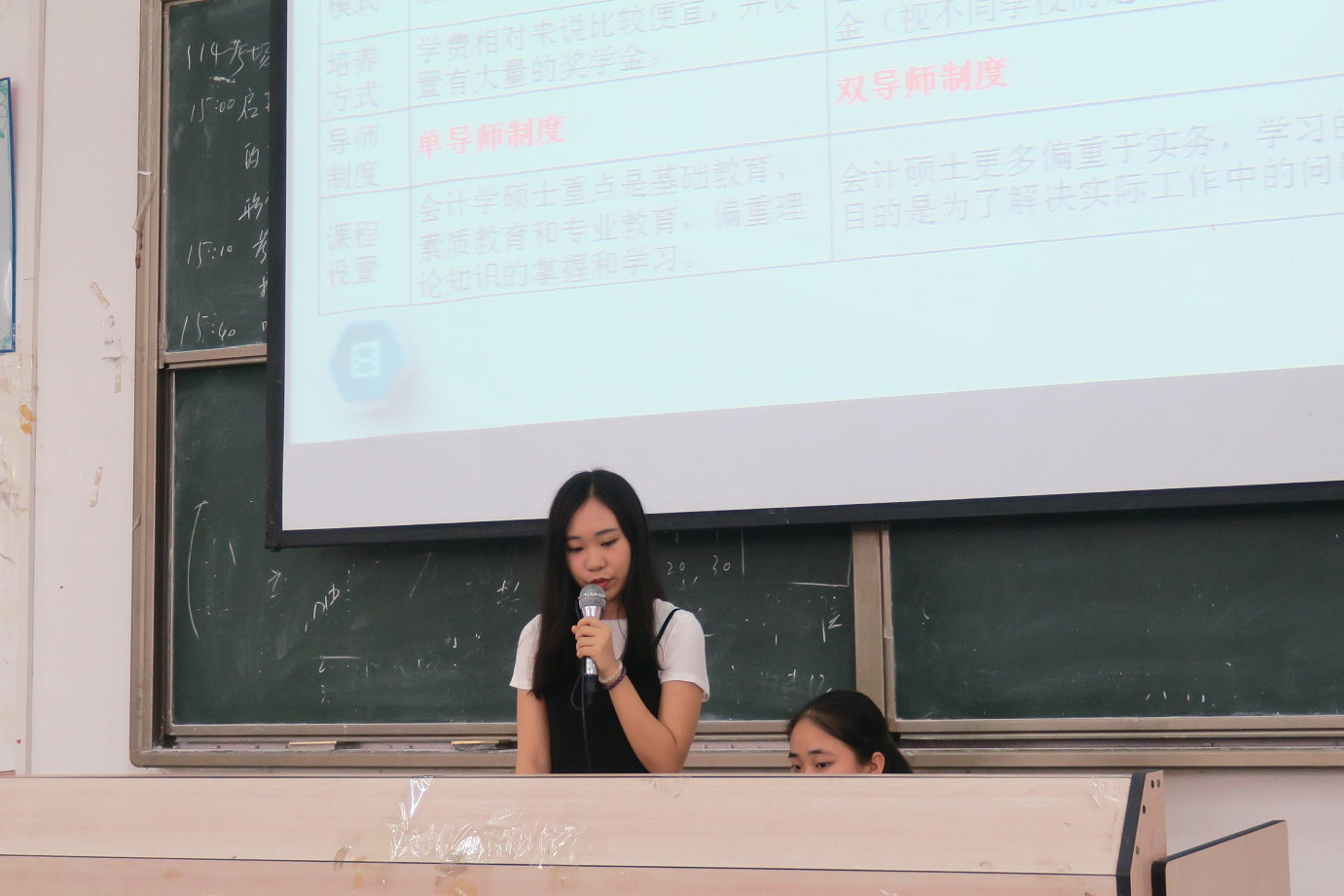 吴迪莎师姐主要讲解考专硕的情况。解析了“什么是会计专硕”、“会计专硕初试科目及报考流程”和“如何准备会计专硕初试”等问题,分享了自己备考的历程和复习方法,让准备考研的师弟妹受益良多。