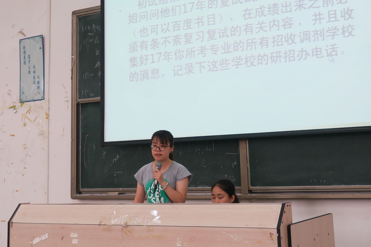 而袁茵师姐以幽默的语调讲述了复试及面试的经历,告诫大家要有“天不怕地不怕”的精神,即使排名靠后也要大胆表达自己的观点,掌握主动权,同时还讲解了调剂技巧和有关联系导师的问题。