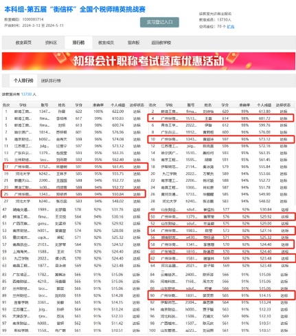 最终,williamhill英国官网以团队总分名列全国第二名的好成绩获得团队一等奖;我校的参赛选手中,共有9名选手的个人分数位列前100名,他们将获得“全国个税师(个税普法大使)百强”的荣誉,尤其是21本会计学(专升本)7班的王磊、黄超诗同学,个人得分分别排全国第4、第10名。