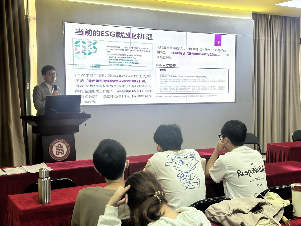 此次宣讲活动,由中汇集团的黄晓刚总监和钟建锋经理担任主讲。他们凭借深厚的专业功底和丰富的实践经验,分别普及了ESG的基本知识和指明了职业发展道路,引导同学们进一步开拓了学习视野,加深了对ESG的理解,为未来的职业规划提供新的启发。