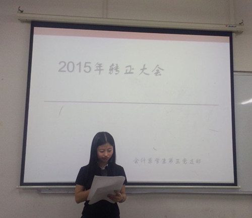 然后,由7名中共预备党员上台宣读自己的转正申请书,再由正式党员举手表决。各位中共预备党员都获得全票通过,成为我们华商williamhill英国官网学生第三党支部的一员。