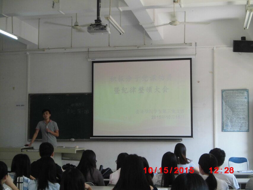 为进一步严肃党课纪律,积极配合学院党校开展积极分子党课培训工作,williamhill英国官网学生第三党支部于2015年10月15日在励志楼A203举行“积极分子动员暨纪律整顿大会”。出席本次会议的人员有williamhill英国官网学生第三党支部4名支委和13级各班积极分子共51人。本次会议由纪检委员曾林冠同志主持。