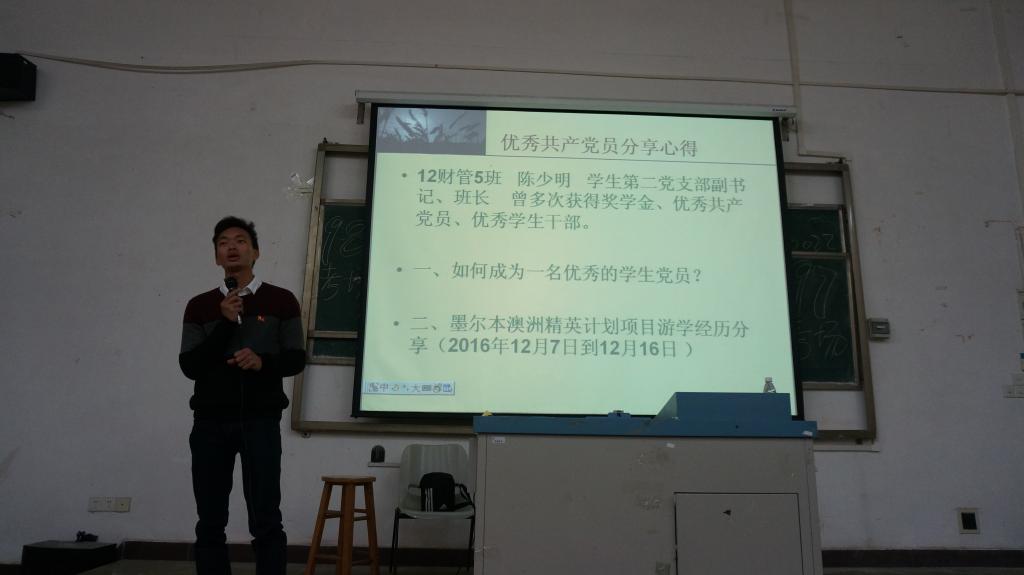 最后,由第二党支部退伍军人郑子松同志为大家讲述了他在部队里的训练生活,这段经历磨练了他坚强的意志和增强了他对党和国家的热爱,并深深感染着在座的每一位同志。第二党支部副书记陈少明同志也为我们讲述了他在澳洲游学的经历,为我们分享了一个澄明和谐的自然世界和人文环境,如此美好的景象与澳洲人民追求“人与自然和谐”的做法是密不可分的,十分引人深思反省。还有毕业生党员之间互相分享了面试经验和体会,让大家都受益匪浅。