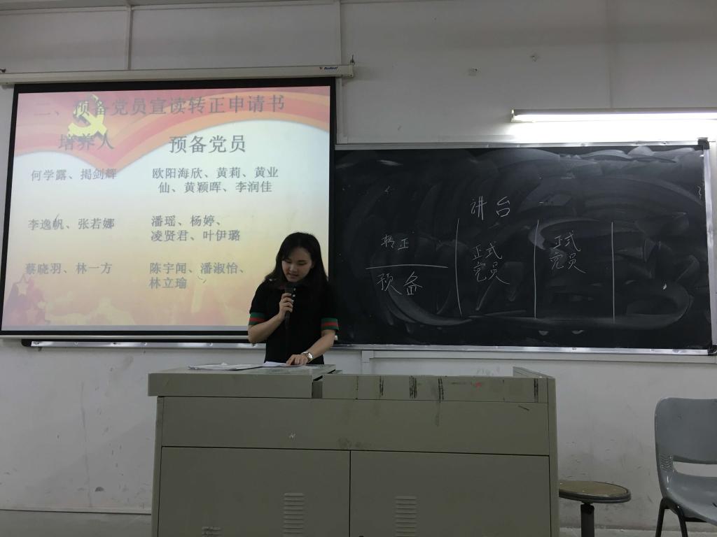 此次会议议由陈少明副书记主持,大会第一项全体起立奏唱国际歌。随后,进入大会重要议程,由本学期转正的预备党员们汇报思想。在会上,我支部的中共预备党员欧阳海欣、黄业仙等12名同志,轮流面对全体党员同志,就关于他们一年考察期的情况进行汇报,并向党组织提出转为正式党员的申请。李润佳同志提到,身为一名党员同志,要有好的思想、好的作风、好的行为,去感染一帮人、帮助一帮人;凌贤君同志表示,共产党员这个称号,更多的是一种责任,我们或许没有能力改变别人,但我们可以改变自己,做好带头作用,认真履行党员的义务与责任!预备党员们轮流总结,提出对正式成为中共党员的真挚申请。