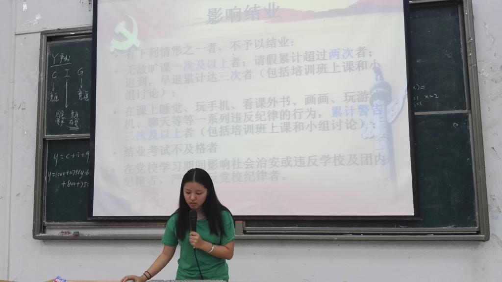 首先,主持人李宇欢同志对各积极分子发表祝贺。然后,她给大家讲解党课教学的考勤制度,要求大家在上党课时遵守好各条考勤制度,祝愿大家顺利完成党课并取得优异成绩。