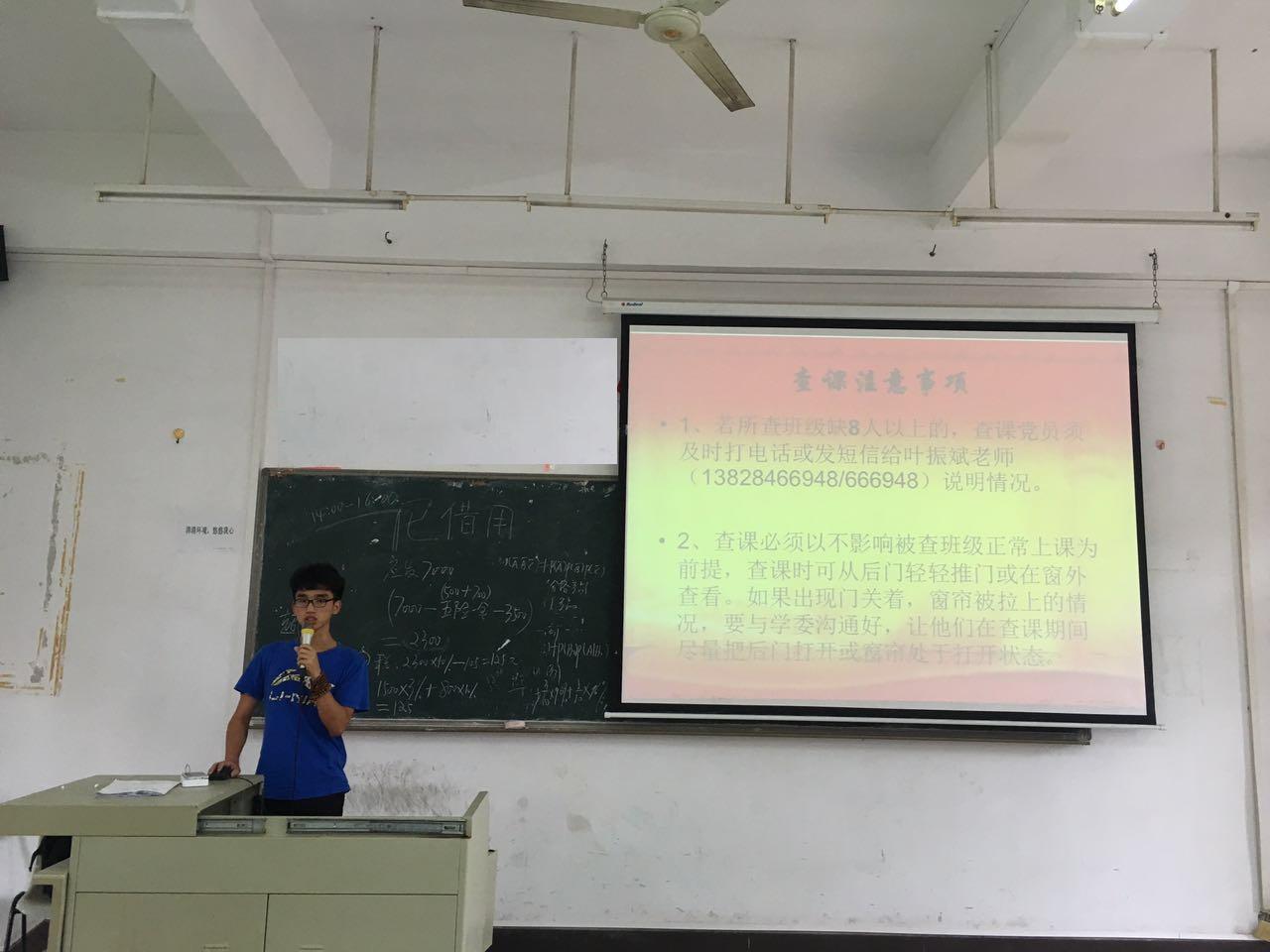 廖强威同志向各位党员同志讲明了党员查课的所代表的重要意义以及此次查课活动中各个党员的工作安排与工作内容、要求。