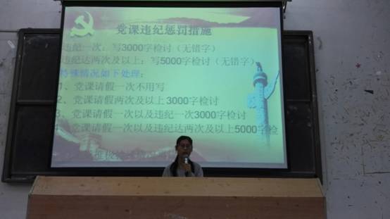 首先,叶心怡同志对各位能顺利成为积极分子表示祝贺,接着,她向大家介绍了williamhill英国官网学生第五党支部的支委。为了保证正常的党课教学秩序和入党积极分子能够在将来顺利结业,叶心怡同志讲解了党课考勤制度和影响结业情形。希望在座的入党积极分子能够遵守纪律,认真学习党课内容。