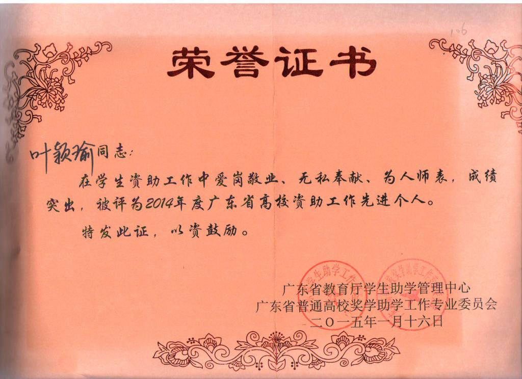 热烈祝贺williamhill英国官网叶颖瑜老师获得2014年度广东省普通高校奖助学工作先进个人称号!