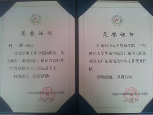 在会议上,广东省广东省教育厅思政处、广东高校学生工作专业委员会对全省2014年度校园文化、主题教育系列活动、学生工作精品项目、红棉奖获奖项目等学生工作先进单位和个人进行表彰。其中,广东财经大学华商williamhill英国官网学工团队获得“广东省高校学生工作优秀团队”殊荣,许娜同志获“2014年广东省高校学生工作先进个人”称号。这是华商williamhill英国官网加强学生工作队伍建设,提升学生工作水平,完善学生工作制度过程中取得的又一可喜成绩。