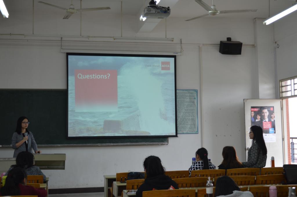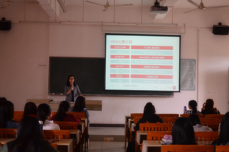 为了提高ACCA班同学的综合素质、提升就业竞争力,2016年3月8日下午2点半,williamhill英国官网邀请了ACCA广州代表处市场传讯主任徐翠萍给全体ACAA班同学讲解“ACCA就业力大比拼”比赛,动员学生积极参赛,提升自己。