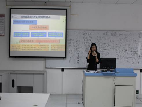 随后,朱小云老师就政府会计准则改革的问题进行了深入的汇报。她先介绍政府会计改革的背景,然后就政府会计准则的主要内容和特点进行了详细的分析,最后通过两个实例对之前所说的内容进行了补充说明,让在座的老师更加深刻到此次政府对会计准则所做的改革。