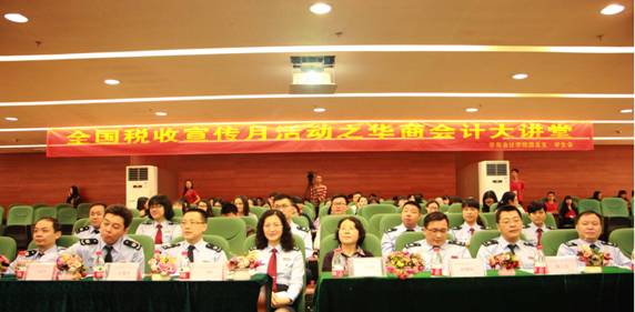 讲台上,增城区国税局纪检组长陈上公,广州市国税局东区稽查局副局长谭斌和该局陈峻杉副科长分别作了《介绍营业税改征增值税试点政策影响》、《如何成为一名合格的税务人员》、《从税务稽查角度谈会计从业人员的必备能力和素质》的主题报告。他们引经据典,结合实例,充分给华商学子们介绍“营改增”的实施现状及所带来的影响,启发学生从专业角度思考自我的职业发展选择和突破,并说明当下会计人员应必备的能力和素质。现场同学们参与踊跃,积极提问,与主讲嘉宾们形成很好互动,会场不时爆发出热烈的掌声。