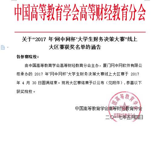 第五届“网中网杯”大学生财务决策大赛线上大区赛于2017年4月30日圆满结束。广东财经大学华商williamhill英国官网首次选拔队伍参赛,经过4月8日初赛和4月17日复赛两轮选拔,选拔出一支队伍参加本届大赛。本届大赛线上参赛队伍一共有152所高校,最终williamhill英国官网参赛队伍获得全国排名39,南区排名14的好成绩,并荣获三等奖。