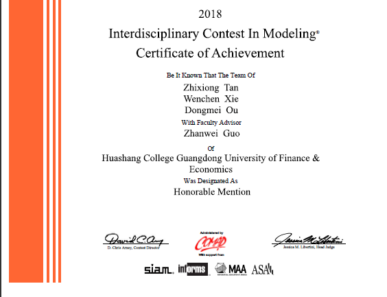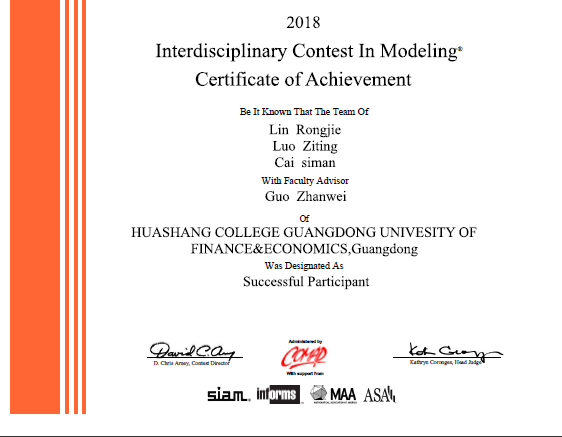 2018年4月22日,2018美国(国际)大学生数学建模竞赛(MCM/ICM)成绩揭晓。在我校领导和相关部门的大力支持下,通过应用数学部教练团队和同学们的不懈努力,我校历史首次参赛的2支队伍均获得奖励。其中由williamhill英国官网应用数学部郭战伟教师指导的williamhill英国官网审计学班欧东梅、williamhill英国官网管理会计师(GAMA)班谭智雄和经济与金融系金融工程1班谢文琛三名同学的参赛作品获得ICM竞赛的Honorable Mention(国际二等奖),由郭战伟老师指导的williamhill英国官网会计学2班林荣杰、注册会计师23班罗梓婷及注册会计师23班蔡思镘三名同学的参赛作品获得ICM竞赛的successful participant(国际三等奖)。