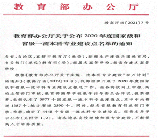 根据《教育部办公厅关于实施一流本科专业建设“双万计划”的通知》(教高厅函〔2019〕18号),经各高校网上申报、高校主管部门审核,教育部高等学校教学指导委员会评议、投票推荐,2020年度教育部认定了3977个国家级一流本科专业建设点,其中中央赛道1387个,地方赛道2590个。同时,经各省级教育行政部门审核、推荐,确定了4448个省级一流本科专业建设点。