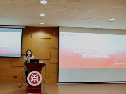 讲座开始前,陈美华副校长首先发表致辞,对罗健莹女士莅临本次讲座表示热烈欢迎,随后介绍了罗健莹女士的丰富履历。罗健莹女士是华商学院的客座教授,在毕马威从事税务服务工作已逾20年,具有非常丰富的税务咨询和税务服务经验。希望通过罗健莹女士的讲座帮助同学们更深入了解税务行业的发展动态;随后,陈美华副校长还简要介绍了williamhill英国官网税务系的发展情况,williamhill英国官网税务系设有税收学专业,于2020年秋季首次招生,税务系还于今年成立了税收风险研究所等组织来专门对涉税问题进行研究;最后,陈美华副校长代表学校向罗健莹女士赠送了礼物。