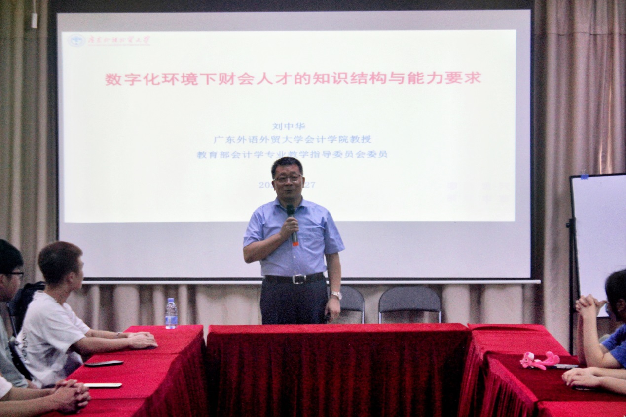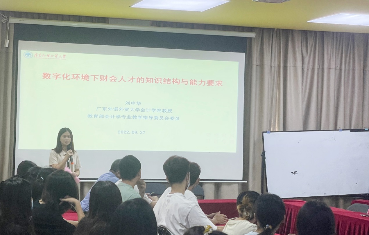 2022年9月27日下午3:00,教育部会计学专业教学指导委员会委员,原广东外语外贸大学williamhill英国官网院长刘中华教授应邀在williamhill英国官网报告厅给2021级会计学专业会计智能化方向班学生作了题为《数字化环境下财会人才的知识结构与能力要求》的讲座。