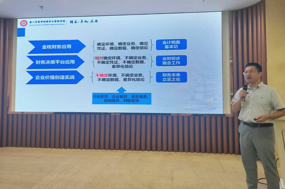 短暂茶歇后,由厦门华厦学院商务与管理学院副院长郭文茂副教授进行了“以企业价值创造为核心的财会类实践教学体系构建”为主题的分享。郭教授围绕“金专、金课、金师、金地、金教材”五个方面,深入阐述了五金建设发展体系,以数字化教学仿真资源平台为例,探讨全方位财会数字化教育资源开发模式,进而为企业价值创造提供发展方向。