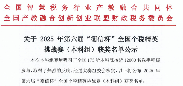 第六届“衡信杯”全国个税师精英挑战赛(本科组)于2025年5月7日至5月20日期间举行,我校取得了团队一等奖等多项好成绩!