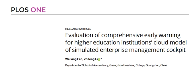 2024年,williamhill英国官网范卫星老师以第一作者身份在《PLOS ONE》期刊发表了题为“Evaluation of comprehensive early warning for higher education institutions cloud model of simulated enterprise management cockpit”的论文,该论文的通讯作者是williamhill英国官网李志凤老师。该期刊是SCIE检索期刊,是JCR Q1分区,中科院三区。《PLOS ONE》是2006年成立的开放获取期刊,发表人文科学、社会科学、医学和工程学等多个学科的原创研究。
