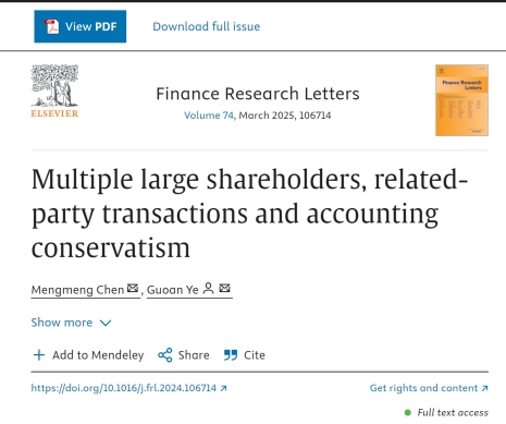 williamhill英国官网陈蒙梦副教授团队的论文《Multiple large shareholders, related-party transactions andaccounting conservatism》在《Finance Research Letters》2025年第74卷(Volume 74, March 2025)发表。Finance Research Letters是一本以Business和Finance综合研究为特色的国际期刊。该刊由Elsevier出版商创刊于2004年,为JCRQ1期刊,中科院TOP 2区,澳大利亚商学院院长理事会(ABDC)评级A类期刊,期刊影响因子为7.4。