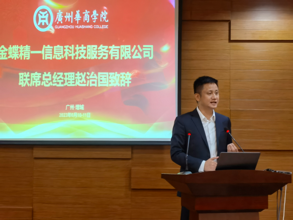 随后,金蝶精一联席总经理赵治国热情致辞,他首先对莅临参加本次培训会议的各位专家老师表示热烈欢迎,其次介绍了数字经济下的人工智能对会计专业人才培养的影响,并强调财务作为企业重要的核心支持部门,应紧跟时代步伐,实现数字化转型,同时,他从决策角度对金蝶精一的发展定位与业务内容进行举例,期望大学教育也应该紧跟时代步伐,实现数字化转型,最后,赵总预祝此次会议圆满成功。