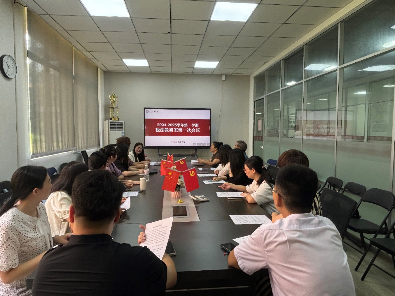 首先,税务系副主任雷雨老师根据学校及学院工作精神,结合税务系实际,从日常教学管理与专业课程建设的角度向各位老师汇报新学期税务系工作计划,包括试卷归档、期初检查、课程建设、磨课安排、学科竞赛、师生培训等。接着,李志凤主任从教科研方面进行了补充,鼓励系部教师应紧抓学校合格评估契机,各尽所能、各展所长,积极申报各级各类教科研项目,努力产出更多成果。最后,李主任对新入职的周国良教授进行了介绍并代表税务系对周教授的加入表示热烈的欢迎,周教授表示将发挥自身所长,为系部和学院的发展贡献力量。会后,各教研室按会议安排组织开展研讨活动。
