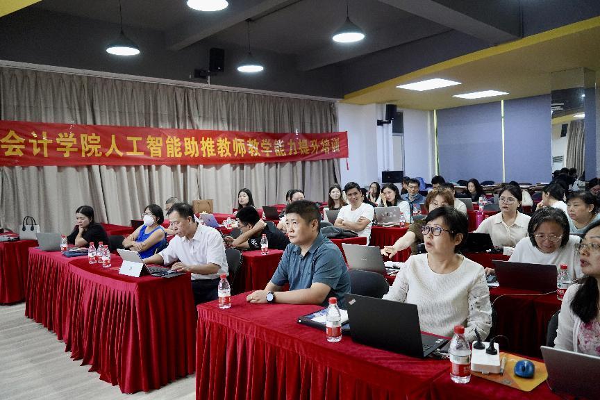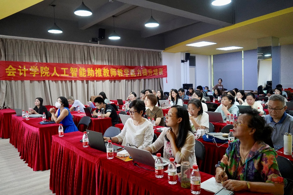 本次培训内容涵盖“学术AI提⽰词、智能体机器⼈搭建,AI赋能教学设计,AI辅助论⽂选题及常⽤⼤模型,AI辅助论⽂正⽂写作的五源模型应⽤”等内容。培训过程中,培训讲师团队结合实际案例,深入浅出地讲解了人工智能在教学中的应用前景和具体方法。从智能化教学工具的使用到个性化教学方案的设计,每一个环节都引发了教师们的深入思考和热烈讨论。