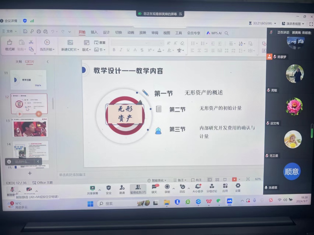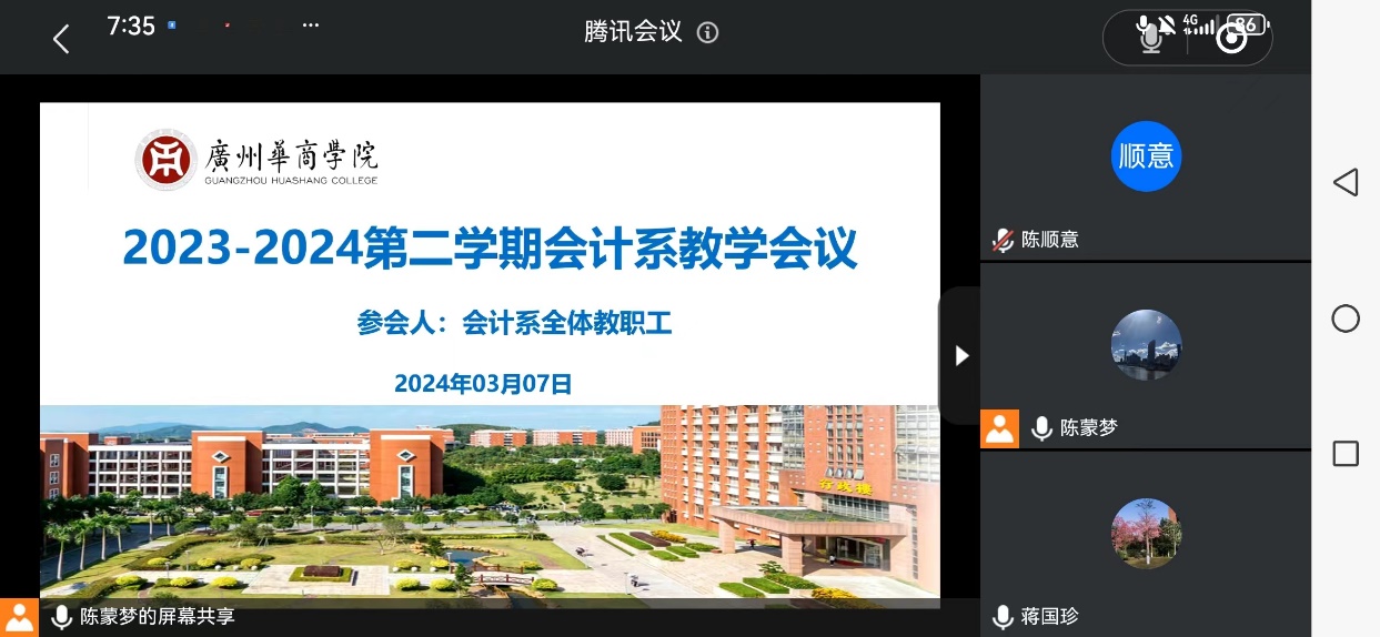 在2024年3月7日晚19点,2023-2024年会计系教学会议在线上召开,此次会议由陈蒙梦主任主持,全体会计系教师共同参与,会议主题为强化磨课精技能,共筑教学新举措。