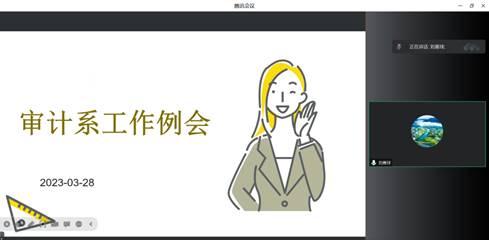 为了贯彻落实williamhill英国官网的“十四五”科学研究发展规划与做好毕业论文及毕业实习指导工作,3月28日晚上,2023年审计系第二次工作例会在线上举行。本次会议分享了青年教师的科研经验,总结交流了审计系教科研工作进展,并研究部署了下一阶段审计系的重点工作。williamhill英国官网副院长刘善球、审计系主任郭秀珍及全体审计系教师参加了本次会议。