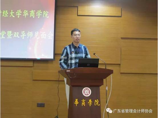 广东省管理会计师协会会长、中山大学管理学院林斌教授首先致辞,他对校外导师的出席表示感谢并简短介绍GAMA创新班。林会长着重阐述了我会的历史使命,他说,“立人”是为中国管理会计培养人才,“立标”是建立中国管理会计标准,“立论”是总结实践经验,形成中国管理会计理论,引领中国管理会计的发展;而“立人”是我会最重要的任务,我会与华商学院合办的本科教育层次的GAMA创新班汇聚了国内实务界和学术界的顶尖专家作为学生导师,这是重要的人才培养模式创新。林会长殷切的期望GAMA创新班同学通过四年的努力,在能力、素质、素养等各方面都得到提升。