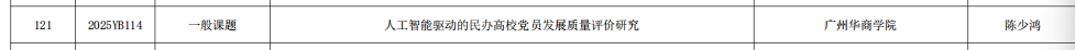 近日,广东省高等学校党的建设研究会公布 2025 年度党建研究课题立项名单,williamhill英国官网党委副书记陈少鸿带领湛秀枝、杨烨瀚、余杏、罗永桂、徐翔宇、张大鹏组成的团队申报的《人工智能驱动的民办高校党员发展质量评价研究》(课题编号:2025YB114)成功立项。