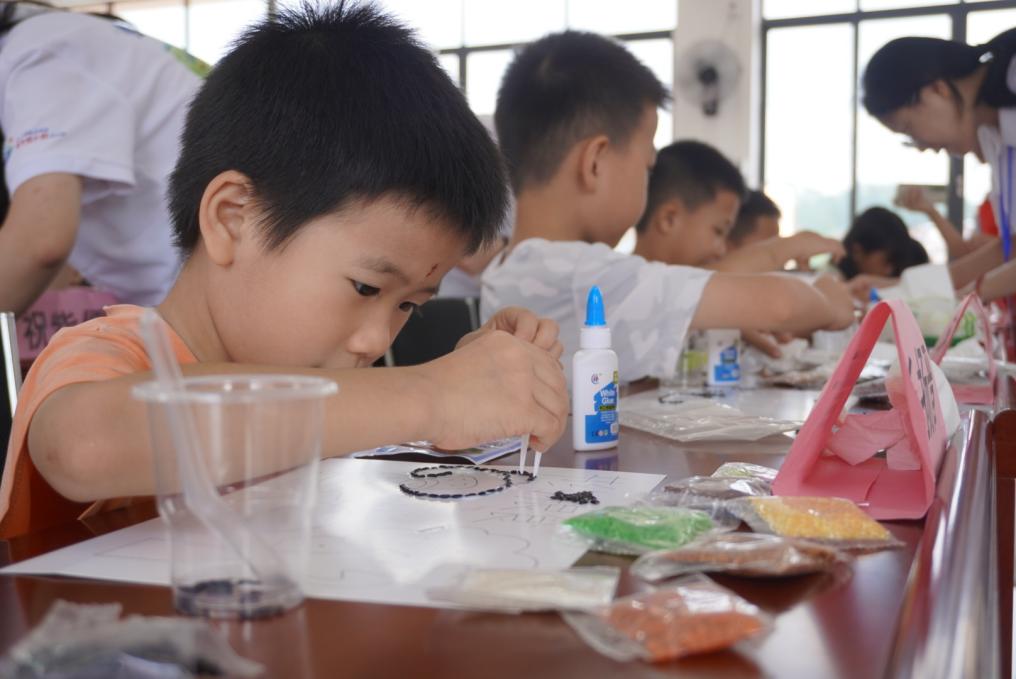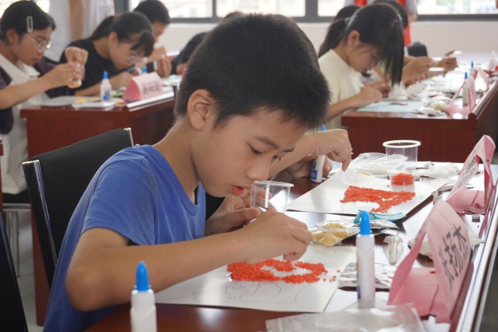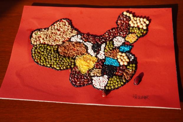 粒米之中藏乾坤,孩子们听着“一粟一饭,心系家国”的讲述,边将种子仔细粘贴,五彩谷物在掌心流转:有的在画中勾勒出金黄的田野,在其中嵌入鲜红的五角星;有的用不同谷物拼出祖国版图轮廓,颜色各异的种子如斑斓星火,栖满在这片承载着希望的土地。当遇难题时相互帮助,协作精神悄然萌芽。每幅作品,不仅有对节约粮食的领悟,更藏着孩子们对土地的热爱、对家国的赤诚——颗颗种子粘起的,是对劳动的尊重,更是对“爱党爱国”最纯真的诠释。