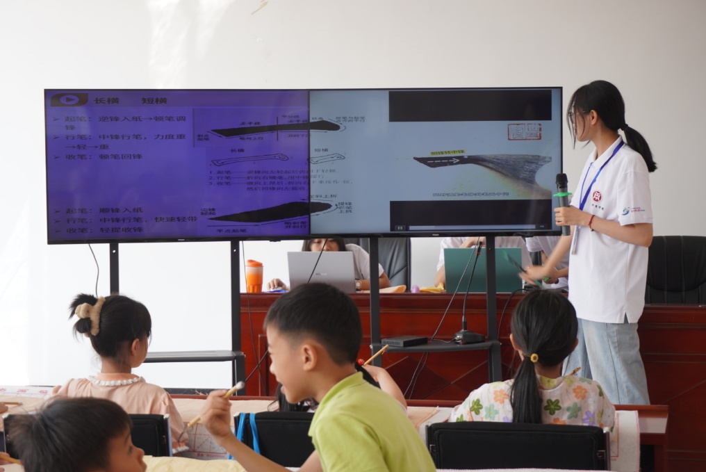 书法,是中国特有的传统艺术形式,承载着千年文化积淀与民族智慧。它以汉字为载体,通过毛笔、墨汁与宣纸的交融,在一笔一划间展现线条的韵律、结构的美感与书写者的心境。它不仅是文字的书写技艺,更凝聚着中国人对“形神兼备”“刚柔并济”的审美追求,是中华文化的重要符号与精神象征。今天,实践团为小朋友们带来了“墨香笔尖为舞”软笔书法基础笔画课堂,带他们走进这黑白交织的艺术世界。
