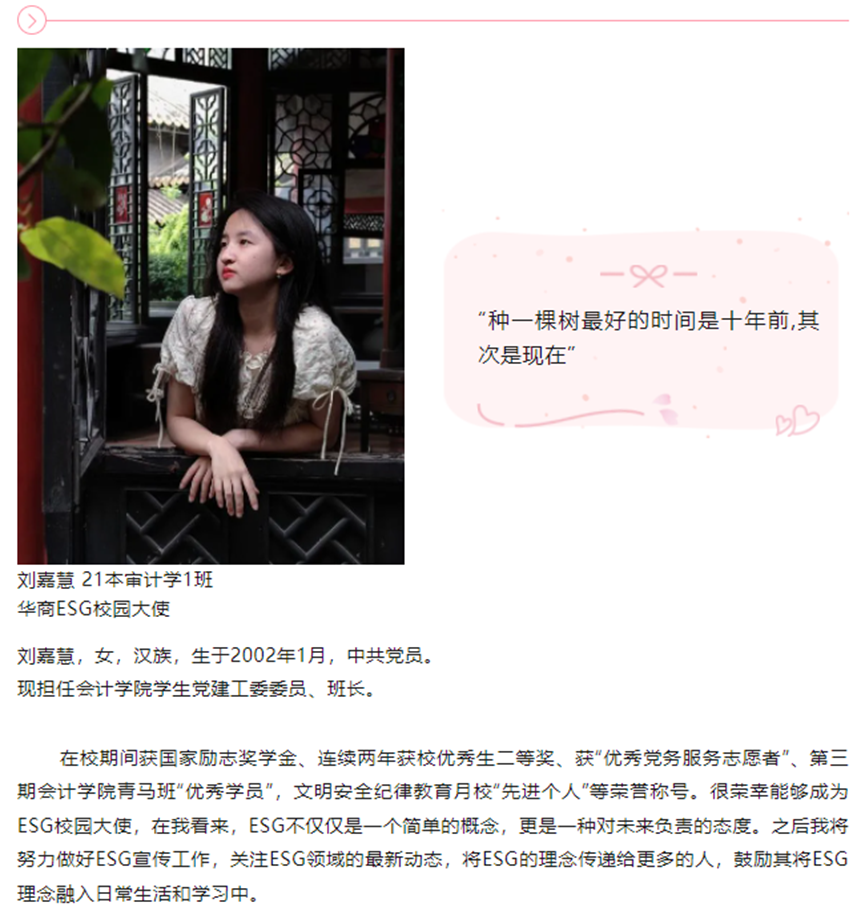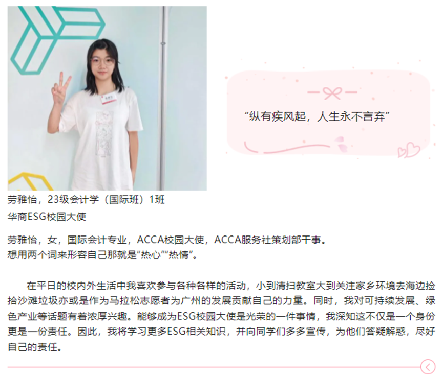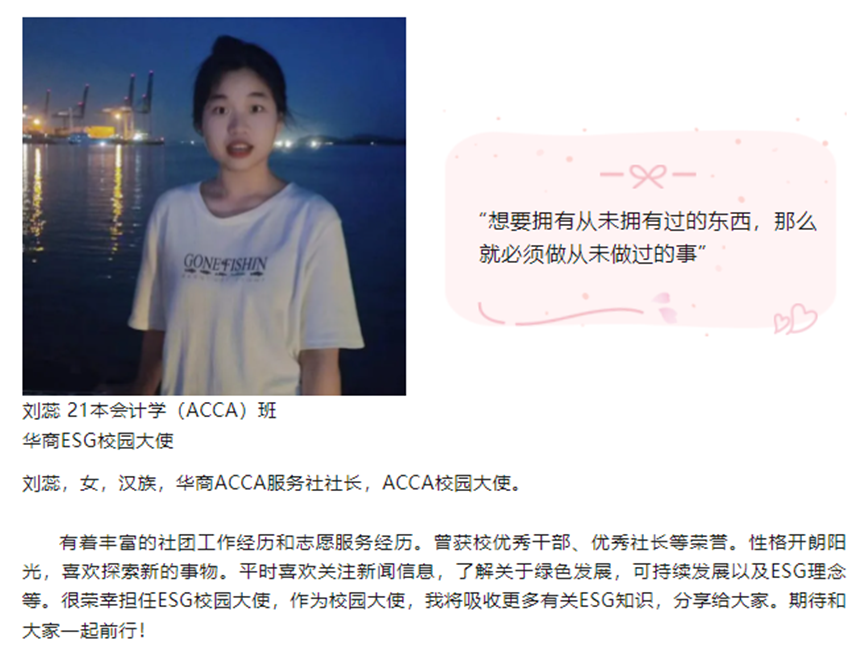 随着ESG行业的蓬勃发展与各项制度的逐步落实,在标准编制、理念推广、信息披露等方面将面临大量的ESG专业人才缺口。华商教育集团、华商williamhill英国官网高度重视ESG人才培养。为进一步推进ESG人才培养各项工作开展,举办了第一届williamhill英国官网ESG校园推广大使评选活动。随着校园大使评选落下帷幕,来自williamhill英国官网的刘佳慧、刘蕊同学,国际学院的劳雅怡同学脱颖而出。在接下来的活动中,他们将承担各项工作任务,一展风采。