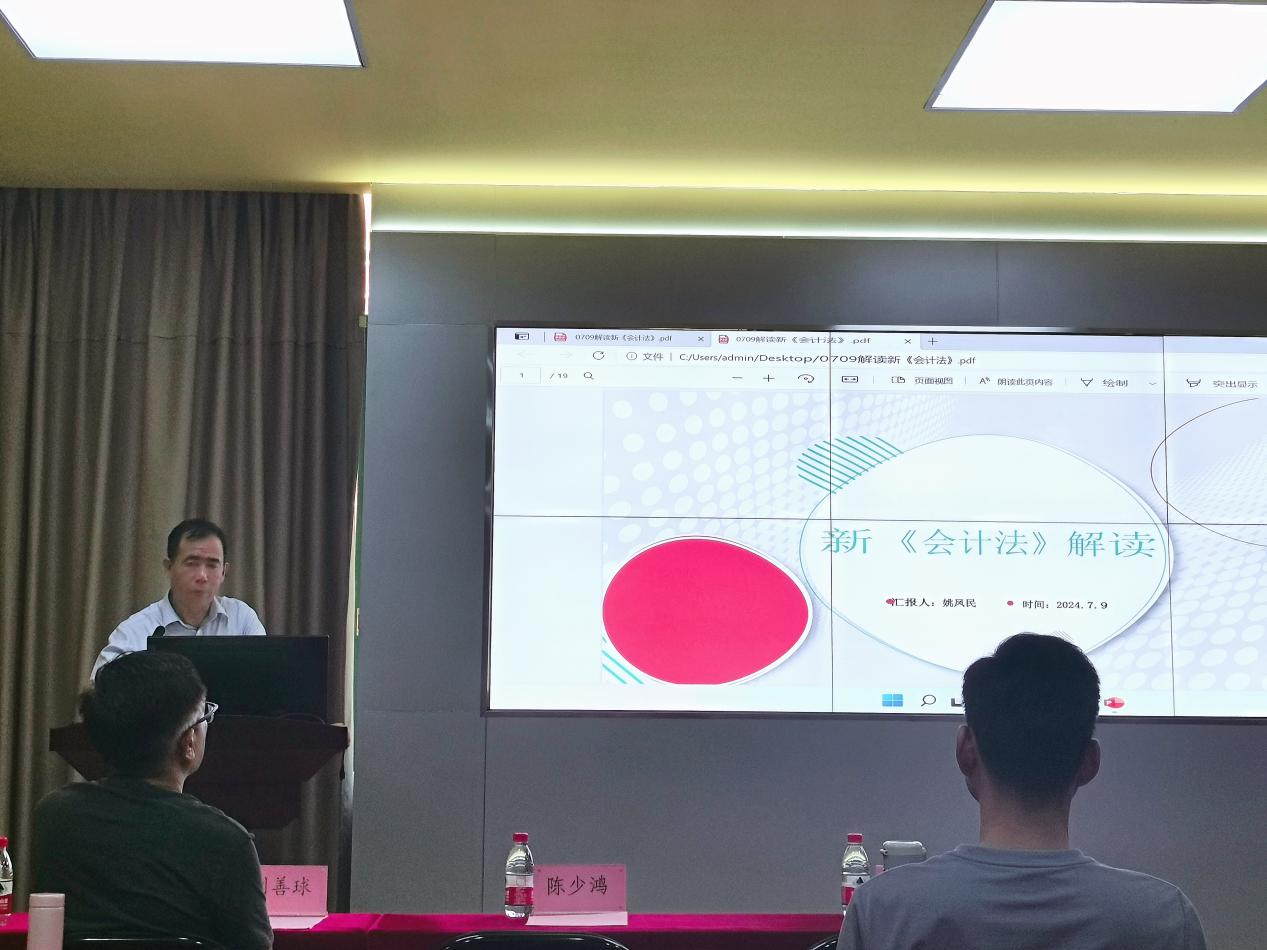 《全国人民代表大会常务委员会关于修改(中华人民共和国会计法)的决定》已由中华人民共和国第十四届全国人民代表大会常务委员会第十次会议于2024年6月28日通过,自2024年7月1日起施行。2023年12月29日,十四届全国人大常委会第七次会议表决通过新修订的《公司法》,自2024年7月1日起施行。为积极响应国家法治建设号召,深入贯彻新修订的《中华人民共和国会计法》与《公司法》精神,2024年7月9日,williamhill英国官网组织全体教师专题学习新《会计法》与新《公司法》,由williamhill英国官网院长姚凤民教授和副院长刘善球教授分别解读新《会计法》和新《公司法》的影响和意义,本次专题学习会由williamhill英国官网院长助理陈蒙梦主持。