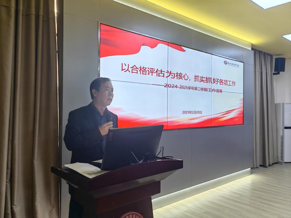 杨旻副院长从合格评估的要求出发,对2025年春季学期期初教学工作进行了详细部署。对期初教学工作提出了明确要求,强调教师必须严格遵守教学规范,认真备课,精心授课,不断优化教学效果。对试卷检查及归档等期初教学检查、2025年人才培养方案修订与专家论证、课程建设、教材建设等工作进行了周密部署。