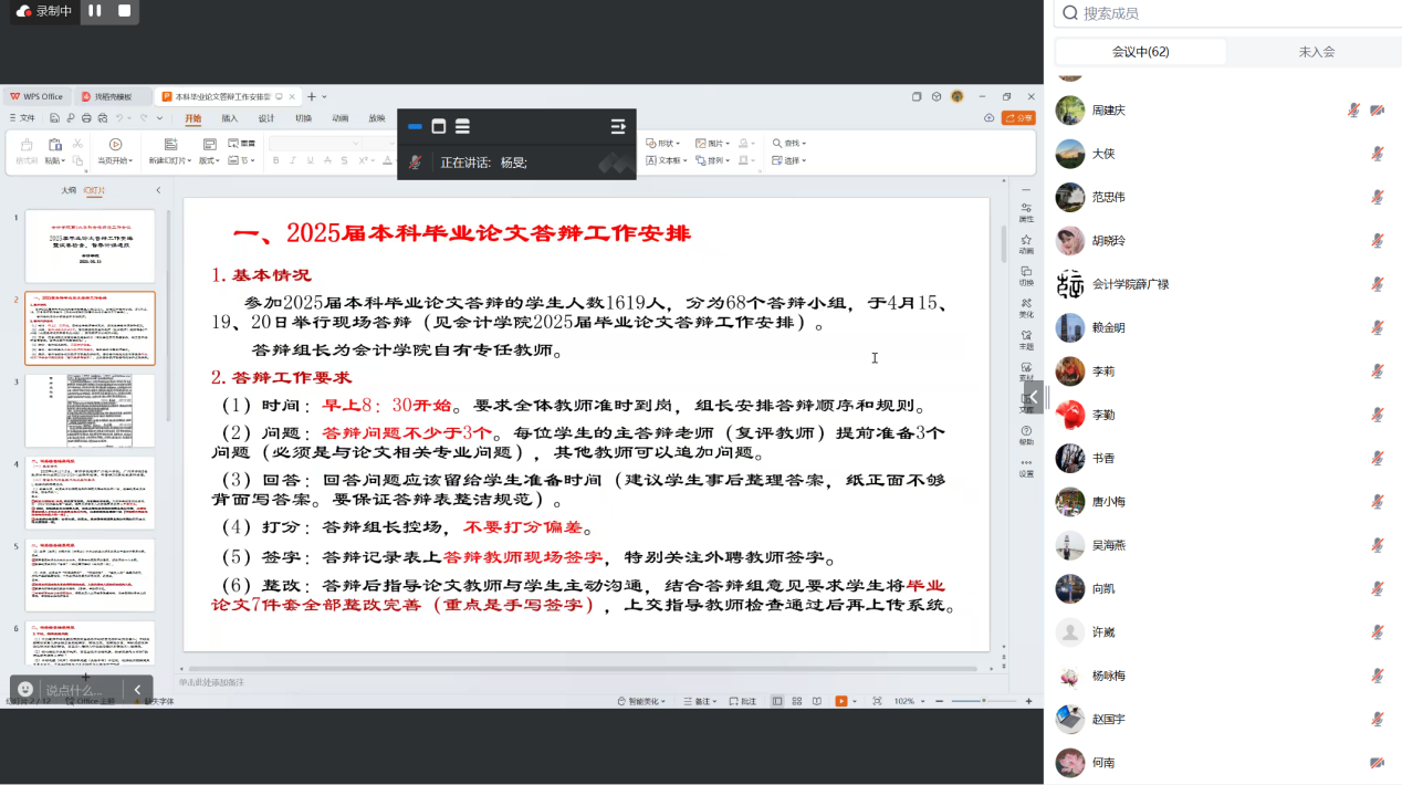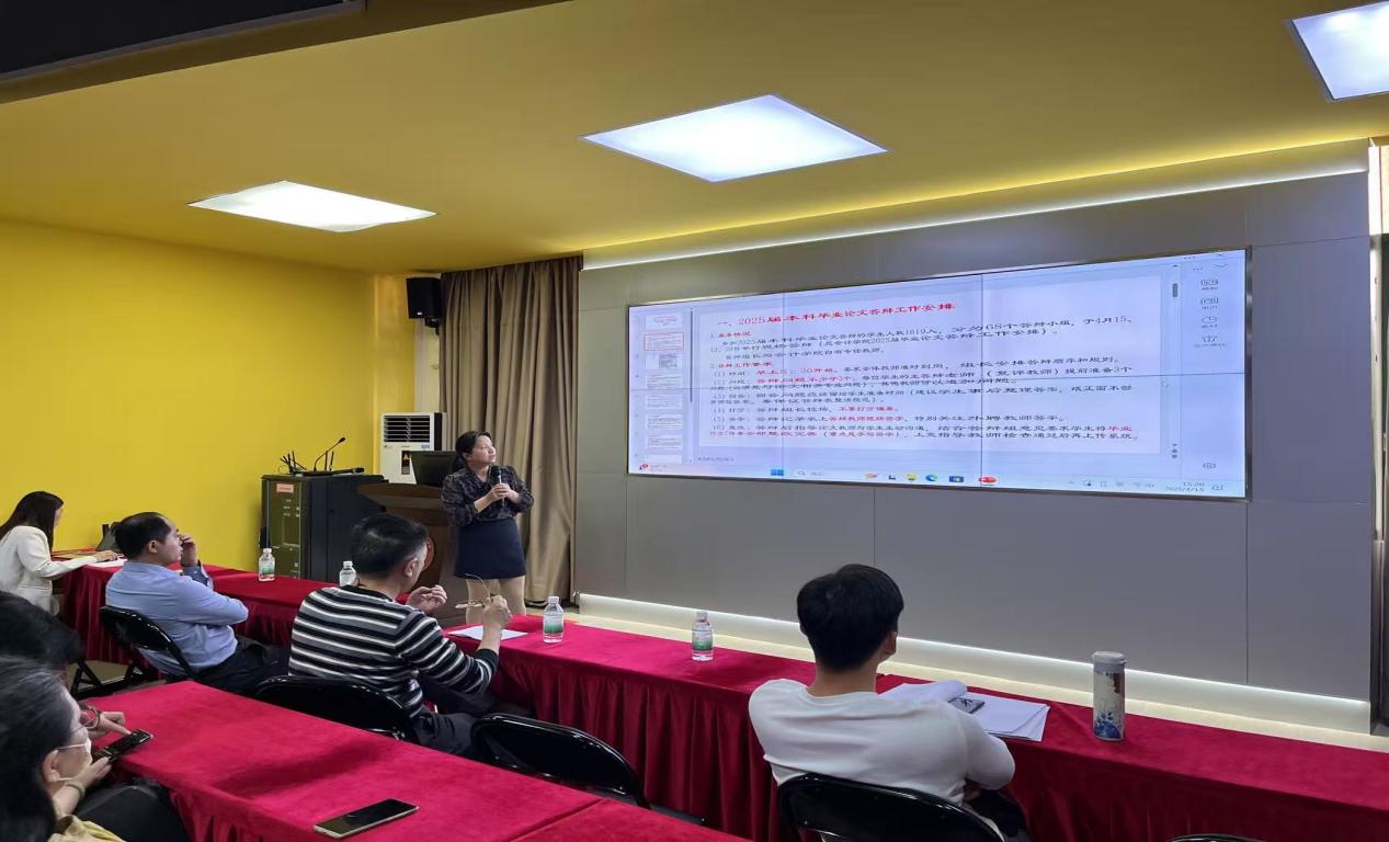 会议伊始,杨旻副院长强调了本科毕业论文答辩工作的重要性,指出毕业论文是学校人才培养的重要环节,也是教育部本科英国威廉希尔官网合格评估的重要内容之一。杨旻副院长介绍了本次毕业论文答辩工作的整体安排,并结合williamhill英国官网往届学生在本科毕业论文答辩工作中存在的问题与经验,从答辩时间、答辩流程、提问回答、成绩评定、材料归档等方面对答辩工作做了全面且细致的说明。她强调了答辩老师的主要职责与要求,提醒答辩老师做好充分准备,明确校内教师与外聘教师要加强沟通协作,在论文预审、答辩提问等环节精密配合,保障答辩工作顺利推进。