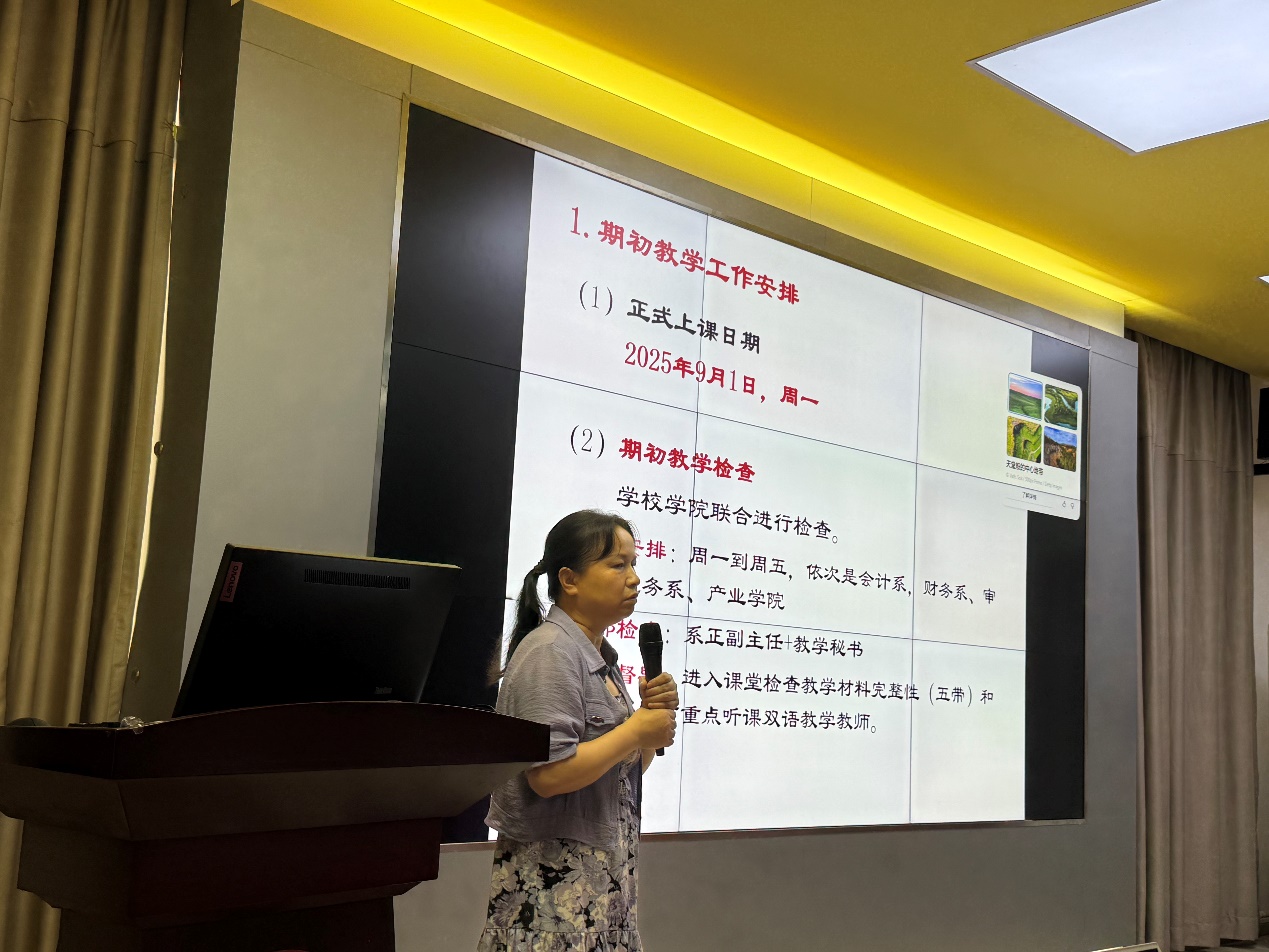 杨旻副院长部署了新学期期初教学工作,要求全体教师高标准做好开学准备,学院将通过期初教学检查保障教学运行即刻入轨、秩序井然;同时明确需开展上学期试卷自查互查,及时整改问题并完成归档。她还介绍了学院专业建设进展,包括2025 版人才培养方案修订、会计学专业方向调整及课程建设情况,强调教师要积极申报 2025 年校级质量工程项目,今年需结题的项目要做好验收准备。最后,她对暑假期间加班整改评估材料的教师表达了诚挚谢意。