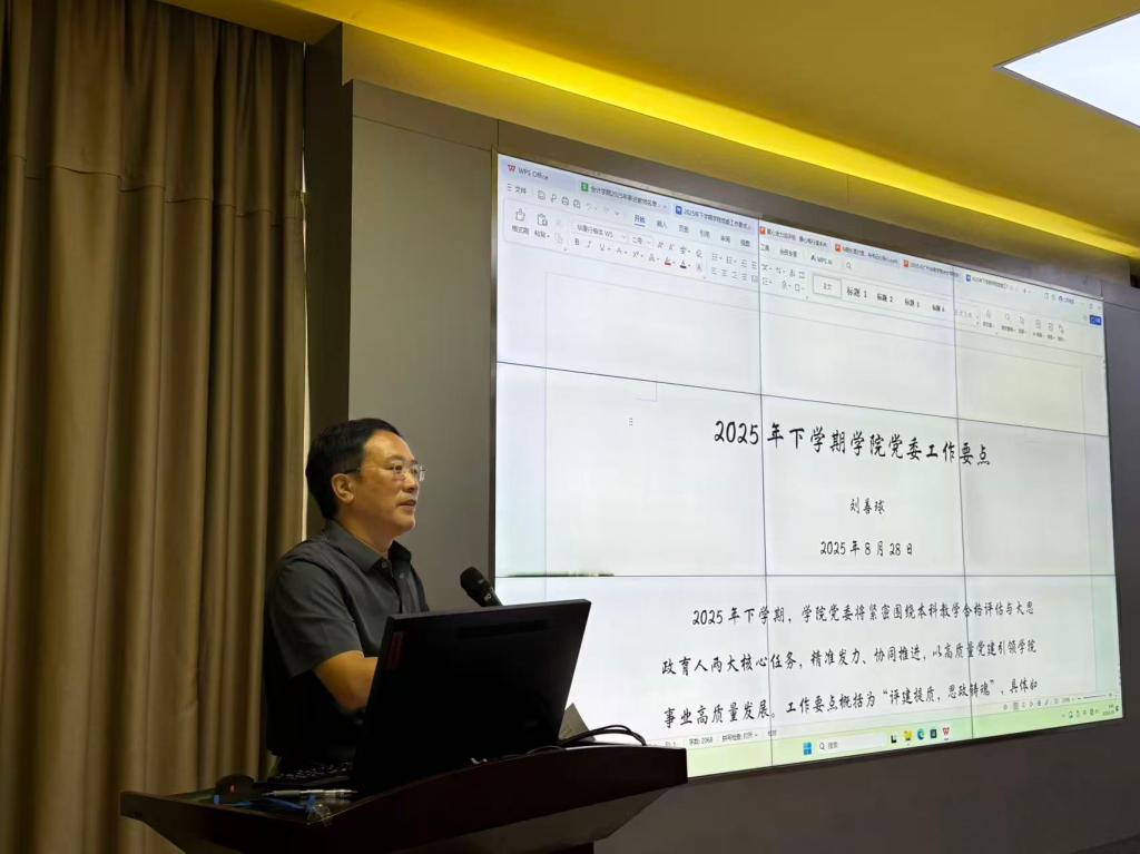 学院党委书记刘善球围绕 “评建提质,思政铸魂” 明确党委工作要点,核心聚焦本科教学合格评估与大思政育人两大任务:评估工作上,通过强化思想引领、深化理论武装、压实党员岗位责任,以党建引领评建,推动全员参与;大思政育人方面,从课程融合、教材案例库建设、辅导员职能强化、“行走的思政课堂” 实践、数字赋能及 “一站式” 管理体系多维度创新;同时,从教师课堂行为规范、学生课堂要求及专项巡查机制入手强化教风学风建设,并提及加强流动党员管理以发挥其先锋作用。