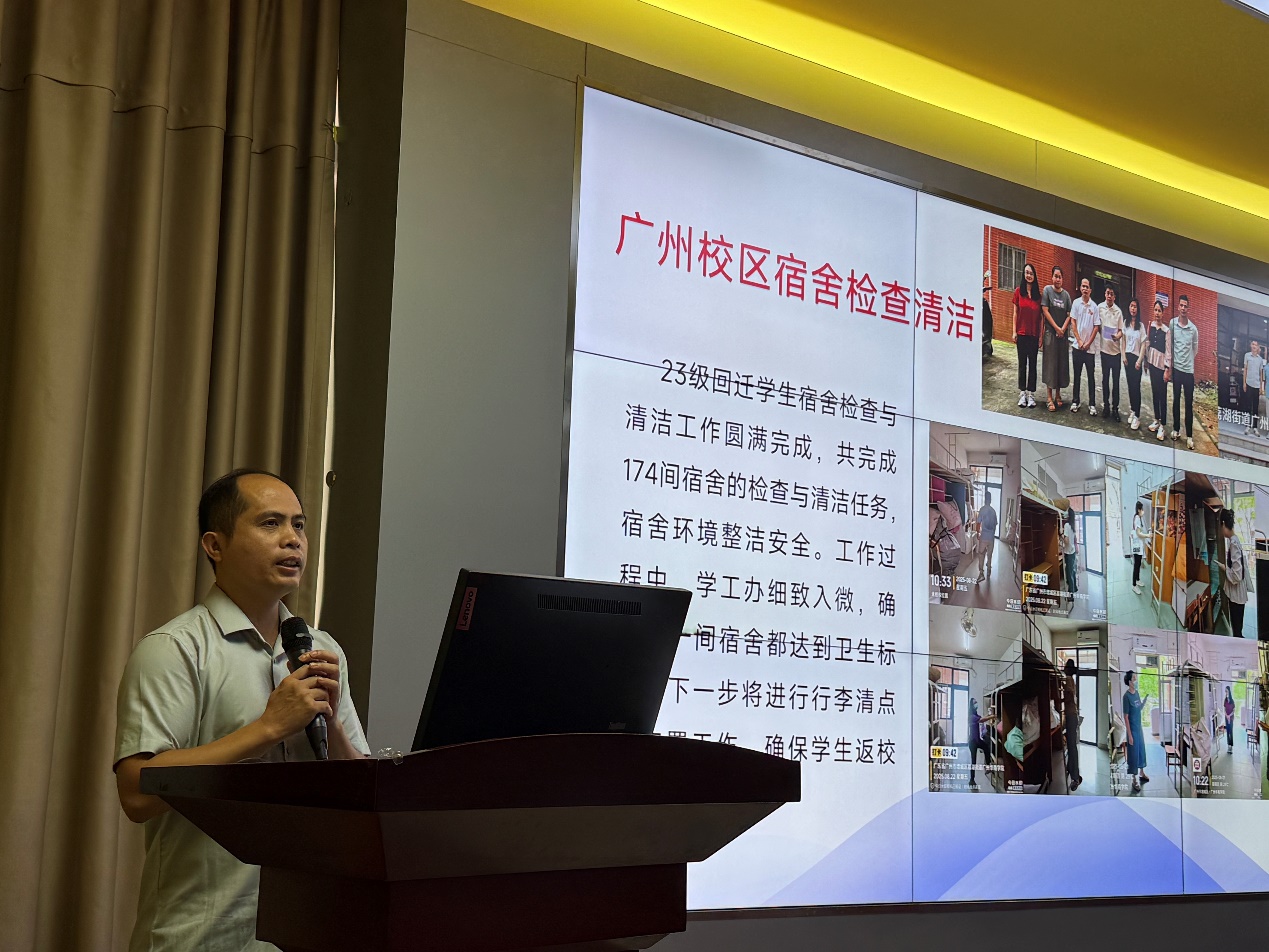 陈少鸿副院长从假期学生宿舍检查清洁、学生暑期社会实践、学生就业促进及合格评估准备工作进行了全面汇报。新学期已实施社区辅导员驻楼办公制度、落实班主任选聘考核与津贴激励机制,完成了两轮新生电话回访并制定迎新方案。他指出学院下一步将从“以评促建、夯实基础、突出实效、规范管理”四个维度持续发力,全面提升学生工作水平。