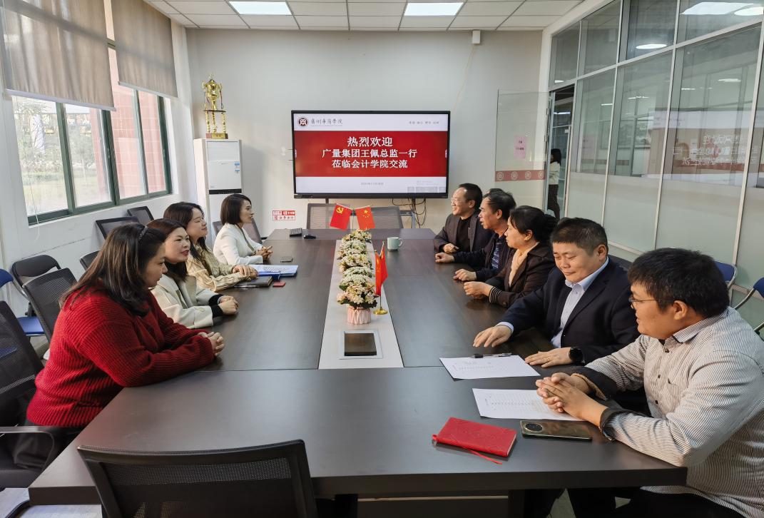 2024年11月28日下午,williamhill英国官网迎来了广量集团高管一行的来访交流,广量集团人力资源总监、广量商学院执行院长王佩及广量集团总裁商务助理袁婉珊莅临williamhill英国官网。此次交流活动为校企双方搭建了一座深度沟通的桥梁,对推动产学研合作具有重要意义。